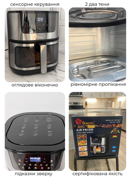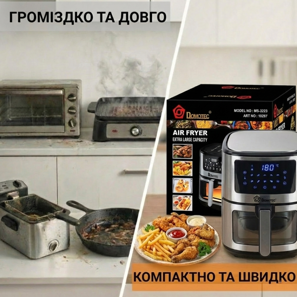 Рівномірна циркуляція гарячого повітря 360° та 2 тени — без зайвої олії.
